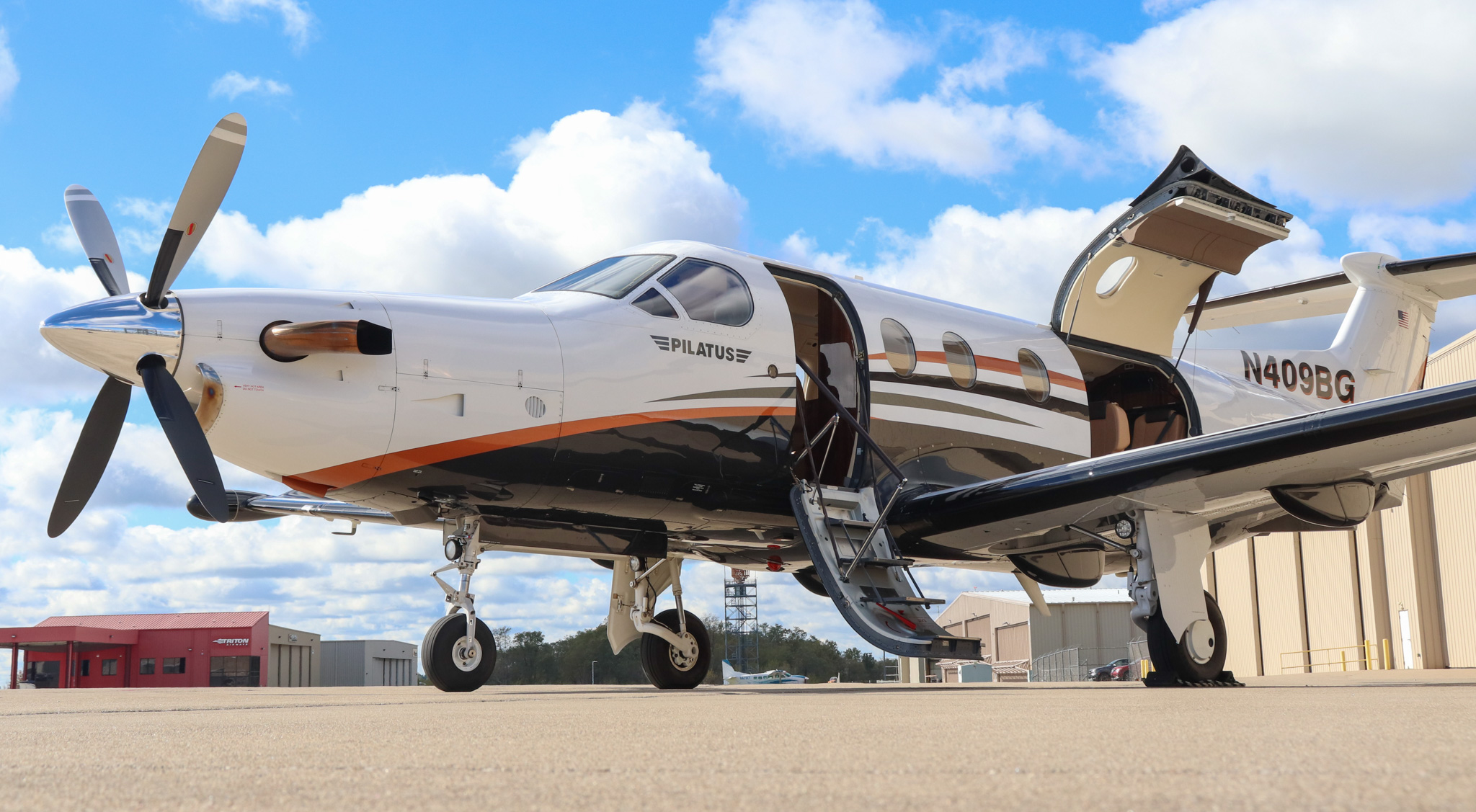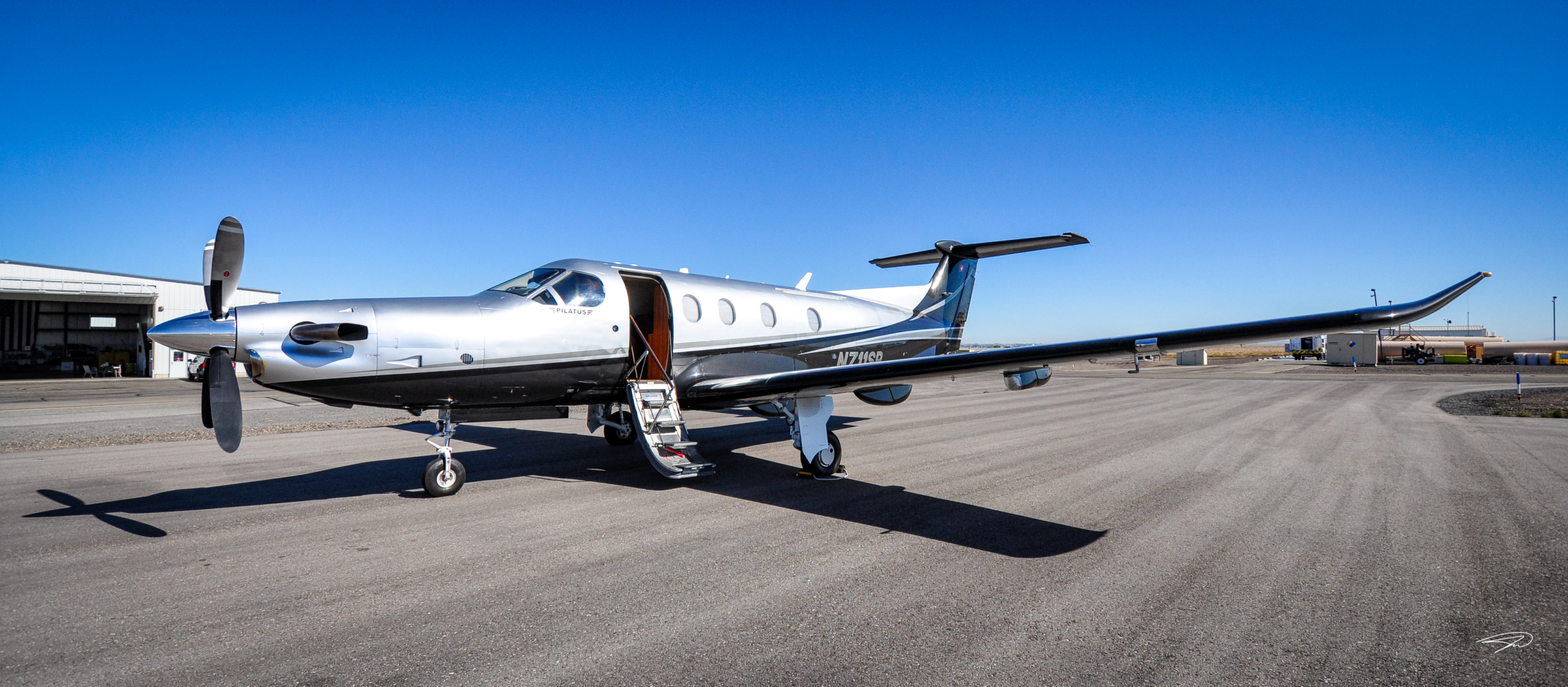 The Pilatus PC-12 is a high performance single-engine turboprop aircraft. It has a 1845 nautical mile max range, a 285-knot cruise speed, and a 30,000 foot ceiling. The large cabin with an enclosed bathroom can seat up to 9 passengers plus one pilot. The aircraft is capable of landing on pavement, grass and gravel strips.